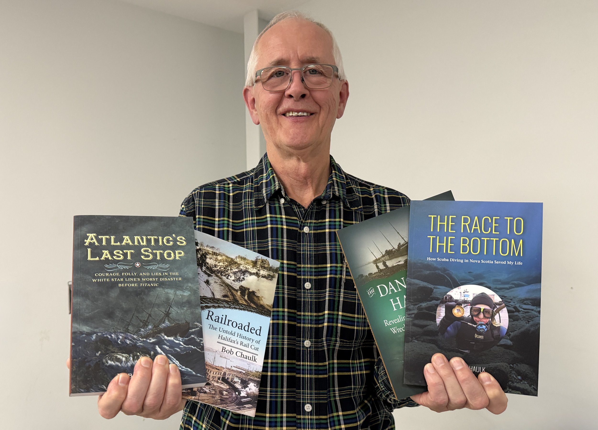 John Corbett, a serious history buff in general and an enthusiast of the SS Atlantic specifically, is passionate about all things Nova Scotia-related. It was not much of a surprise that he wanted to attend a local author’s book launch. I knew in advance he would be doing that. I knew that someone who would be publishing a book about the area had to be passionate about the subject matter. When I found out that the author, Bob Chaulk, a scuba diver, had written seven books in total, all history-related, I knew I had to meet him. I asked if John could arrange an introduction and see if Bob would consider being included as one of my subjects in the book.